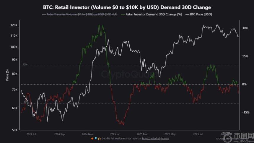 比特币零售需求显著回落:30天变化率降至7月以来最低点