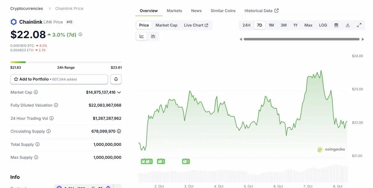 Chainlink (LINK) 的价格前景持续受到关注,该代币在经历了一个强劲的季度后,目前交易价格在 22 美元左右。分析师指出,LINK 的技术面走势稳健,支撑位在 20 美元附近,并有望突破 25 美元附近的阻力位。其季度表现上涨逾 80%,表明其势头正在复苏,这得益于预言机集成度的提升以及 Chainlink 跨链互操作性协议 (CCIP) 的广泛采用。许多预测认为,到 2025 年,LINK 的价格将保持在 22 至 30 美元的区间内,一些预测认为,如果机构用例得到扩展,LINK 的潜力将更大。