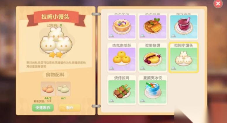 拉姆小馒头的原材料为鸡蛋和鸭蛋,属于基础菜谱无需额外解锁。制作过程中每次烹饪默认产出8份成品,单份售价71摩尔豆,保温时间为2分30秒。若通过尼克餐厅的烤箱制作,则需提前准备面粉,面粉可通过家园种植小麦后加工获得。两种制作途径的成品属性一致,仅消耗资源和时间存在差异。