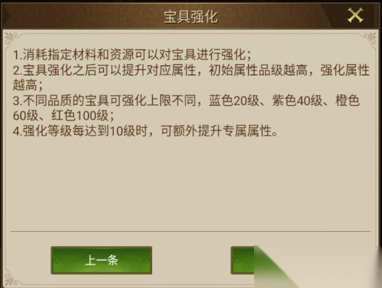 宝具强化玩法功能在锻造行会内进入,也可以在背包-宝具内找到想强化的宝具直接操作强化; 宝具强化玩法需要特别注意的就是不同品阶的宝具,强化等级上限不同,其中红色的强化等级上限最高为100级;