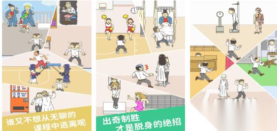这就是一个以搞怪作为核心的解谜闯关游戏,主角想要翘课,那你就必须要想尽一切方法和老师去斗智斗勇。每一个关卡的通关路子都会有所区别,你就需要打破常规的思路,另外在场景中也会有一些能用的道具,你必须要找准时机用对地方。从画风来看相对是比较活泼的,而且整个氛围都会让人爆笑,在玩的时候忍不住意犹未尽,玩起来真的是一点都不会枯燥,很适合想要放松的人。