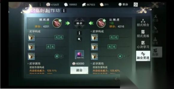 重复心决攻略中的步骤,我们可以得到若干个六孔全绿的自创武学,如果将它们两两融会贯通,就会得到更多、可能更少、也有可能一样的孔数的自创武学。