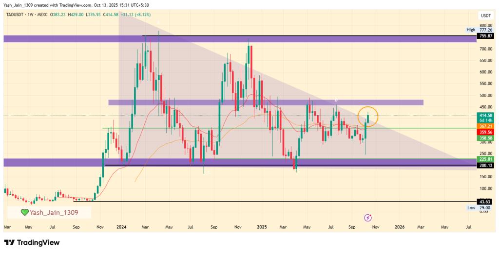 Bittensor 陶价格预示着下降三角形形态的重大突破,暗示可能出现长期反弹。