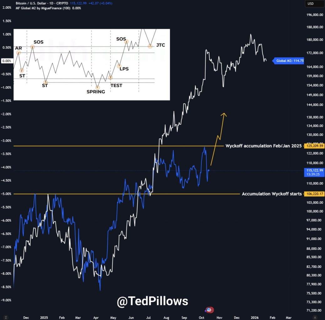 加密货币分析师Ted Pillows表示,在上周市场重置后,比特币(BTC)可能即将迎来大幅反弹。他指出,BTC近期的表现逊于全球M2货币供应量,但他暗示,回调可能已经结束。