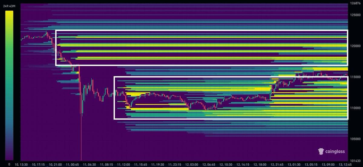 加密货币分析师 Ted Pillows 强调了目前正在影响市场动态的两个关键比特币 (BTC) 流动性集群。据 Pillows 称,第一个集群位于 109,000 美元至 113,000 美元之间,而第二个集群位于 117,000 美元至 121,000 美元之间。