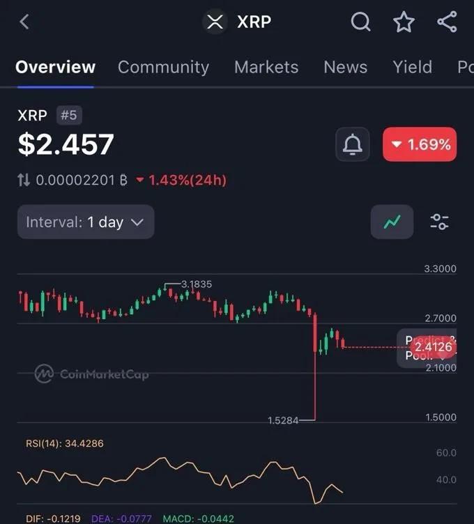 技术面来看,投资者的谨慎情绪日益高涨。XRP 的相对强弱指数 (RSI) 徘徊在 34 附近,表明该加密货币正接近超卖区域。