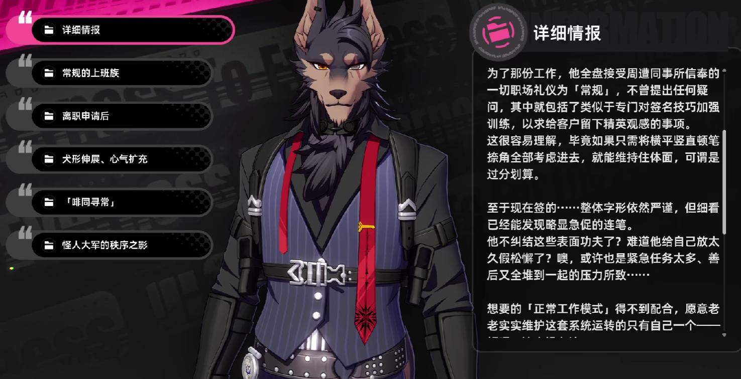 翳是游戏当中的兽人角色,它隶属于意向管理局的禁置机动队,职能是副队长,他有着狼首人身,身着深蓝色的西装,并且在释放技能时,会为自己戴上狼头面具。