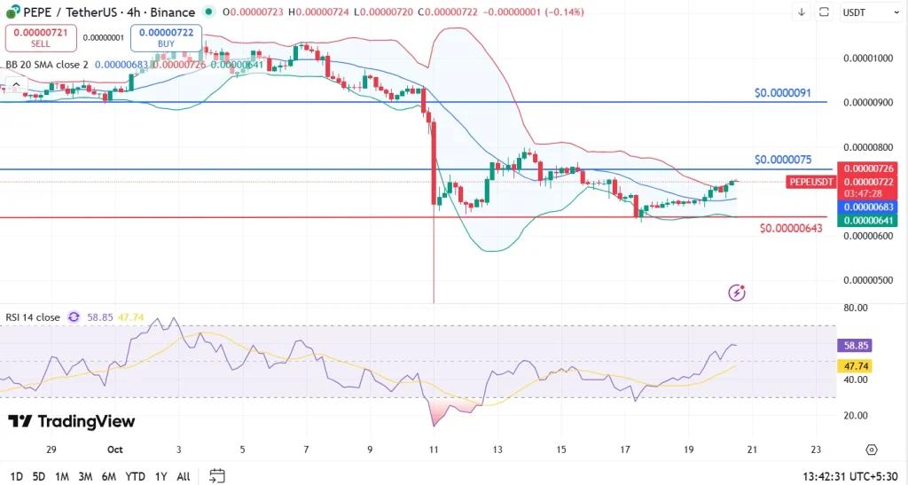下行方面,强劲支撑位已在 0.00000643 美元形成,与布林带下轨持平。该区域已多次测试,确认为多头的关键防御区域。RSI 已攀升至 58.85,暗示动能正在改善,但尚未发出超买信号。这表明,在交易员开始锁定利润之前,短期内仍有上涨空间。