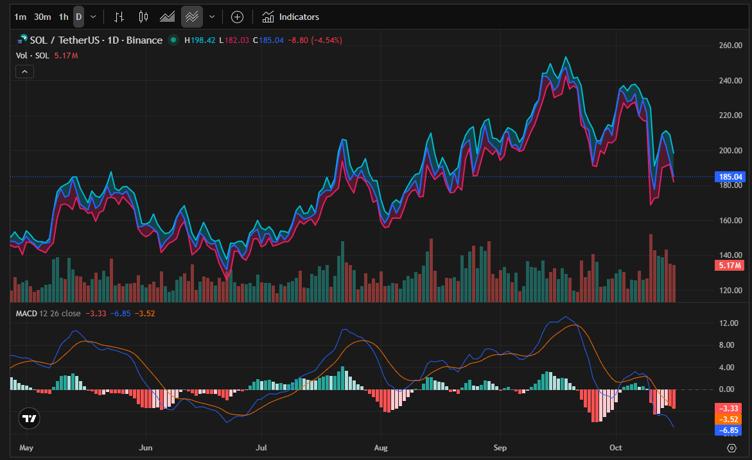 Solana (SOL) 在过去 24 小时内下跌近 4%,交易价约为 185.37 美元,目前面临巨大的抛售压力。技术指标反映出混合信号,RSI 为 42,MACD 看跌交叉表明趋势强度正在减弱,但 EMA10 低于关键移动平均线,证实了近期下行风险。