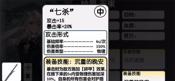 柚恩的技能其实非常适配蛞蝓,但是装备栏限制了只能携带中型和重型装备,如果有队友的情况下其实也可以选别的,所以这里大家可以尝试选择七杀重剑追输出,她搭配了七杀之后攻击上面有+15的数值提升,然后在暴击率上面也有20%的加成,这样再基础的频率上面就可以达到6s/次的输出,然后伤害倍率也可以达到150%的数值,同时伤害类型就是基础的物理伤害。