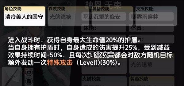 柚恩角色技能上面可用的是清冷美人的固守这个技能,效果是一到进入战斗时,柚恩就可以获得自身最大生命值20%的护盾,当她自身拥有护盾时,可以造成的伤害就会提升25%,切受到减益效果持续时间-50%,这里只要是技能生效那么每一次通常攻击都会对敌方随机目标额外发动一次特殊攻击,所以算是一个通常攻击的强化效果。
