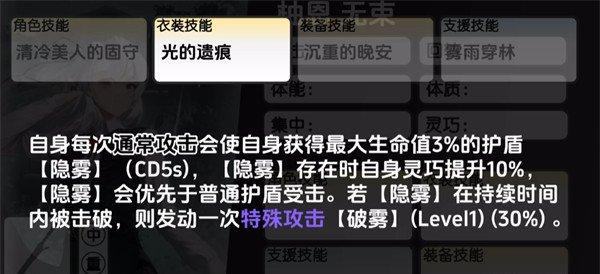 衣装技能叫做光的遗痕,只要是柚恩使用这个技能,那么每一次使用通常攻击的时候,都会使她自身获得最大生命值3%的护盾【隐雾】,这个护盾的持续时间是达到了5s的,而【隐雾】属于她的一个专属状态,生效的时候只要存在场上,那么柚恩自身的灵巧会提升10%,然后【隐雾】会优先于普通护盾受击,如果【隐雾】在持续时间内被击破,则发动一次特殊攻击叫做【破雾】,输出也有30%左右的提升效果。