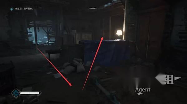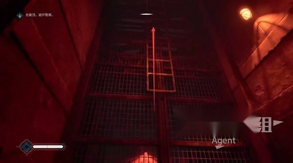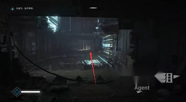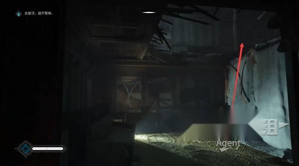 往前走,从地板上的洞跳下来,等走廊上的人走开背对着你的时候,迅速进入走廊侧边的管道。
