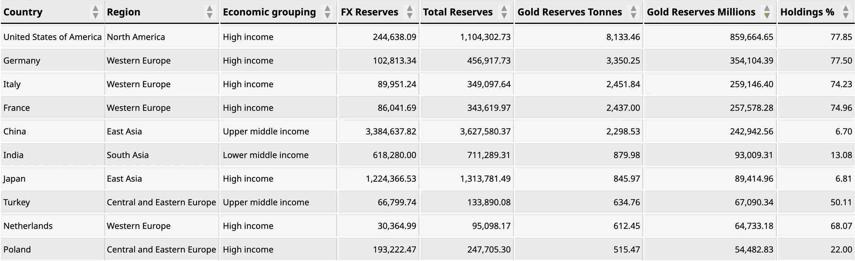 看看各国央行的黄金储备占比,发达国家和发展中国家完全是两个世界:
