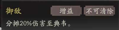 典韦的最核心技能,一切机制都要以本技能作为起点。分摊伤害时如果攻击发起方在典韦3-4格之内,即可触发天赋的<追击>,每回合没有次数限制。另外需要注意本技能不可以对NPC释放。