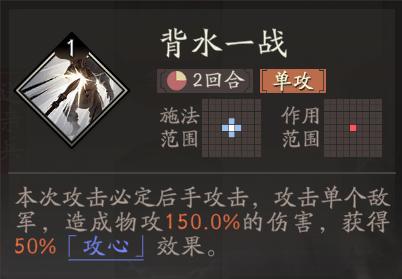 前期唯一可以使用的通用技能,系数很高但是因为必定后手,即使<攻心>判定极高,用起来手感一般,但是因为典韦被反击也可以触发天赋<万夫不当>,所以也是他对单系数最高的技能。