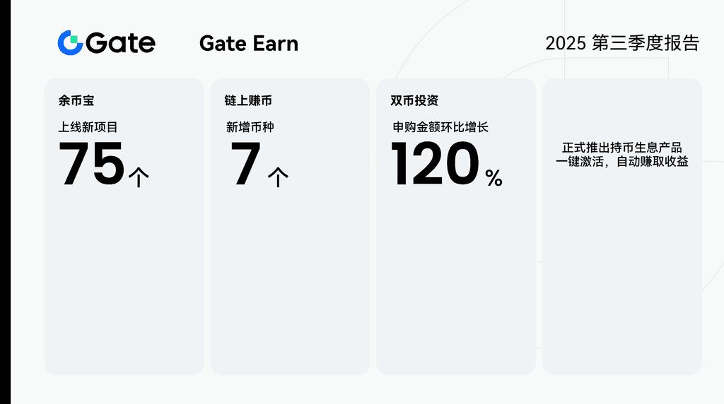 9 月正式推出持币生息产品,用户只需一键激活,即可通过现货持仓自动赚取收益,无需锁仓,资产依旧灵活可用。整体来看,Gate Earn 在产品供给、用户活跃与资产增长三方面实现协同提速,全面巩固其在 Gate 平台收益生态中的核心地位。