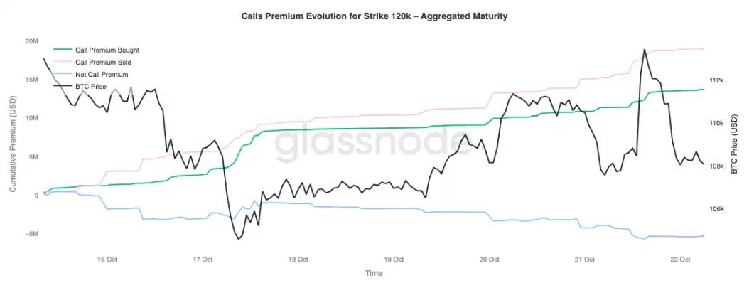 Glassnode 的汇总权利金数据在按行权价细分时确认了相同的模式。在 12 万美元看涨期权处,卖出的权利金随价格上涨而上升;交易者正在抑制上涨走势,并在他们认为短暂的强势中卖出波动率。短期收益寻求者正在利用隐含波动率的飙升,在反弹时卖出看涨期权,而不是追涨。