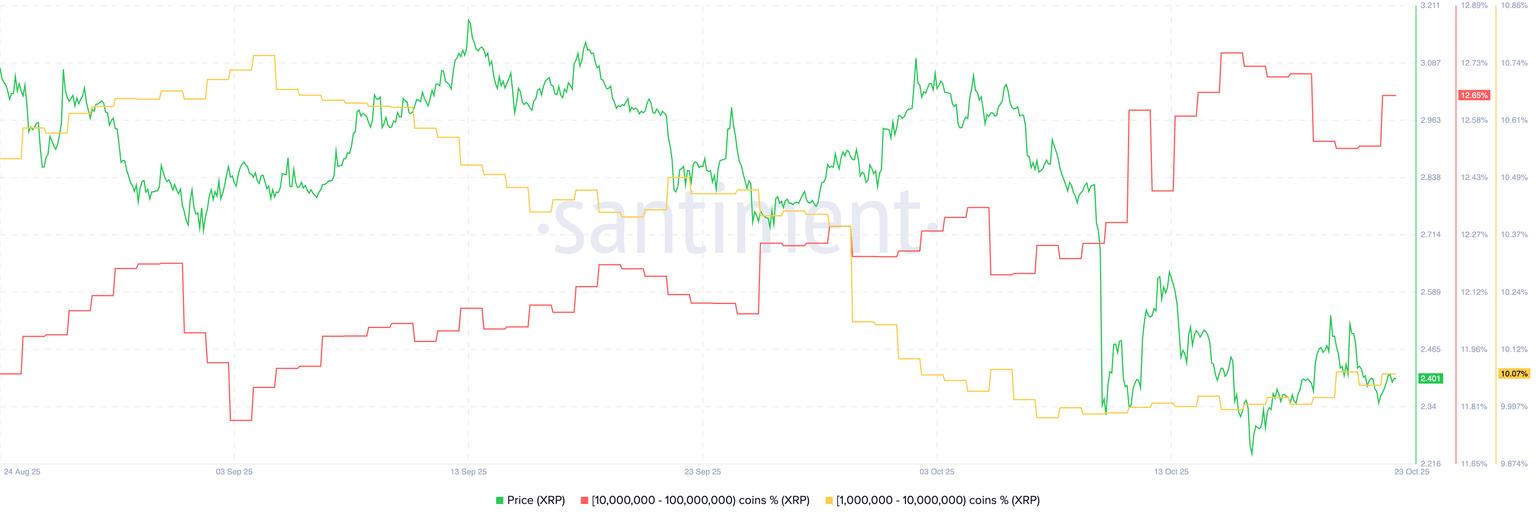 随着价格波动,大量 XRP 持有者,尤其是持有 100 万至 1000 万枚 XRP 的“鲸鱼”正在大举买入。Santiment 数据显示,这些“鲸鱼”在 10 月 10 日去杠杆事件发生前就开始购买 XRP,该事件导致 190 亿美元的加密资产被清算。目前,“鲸鱼”持有 XRP 总供应量的 12.65%,高于 10 月 6 日的 12.16%。