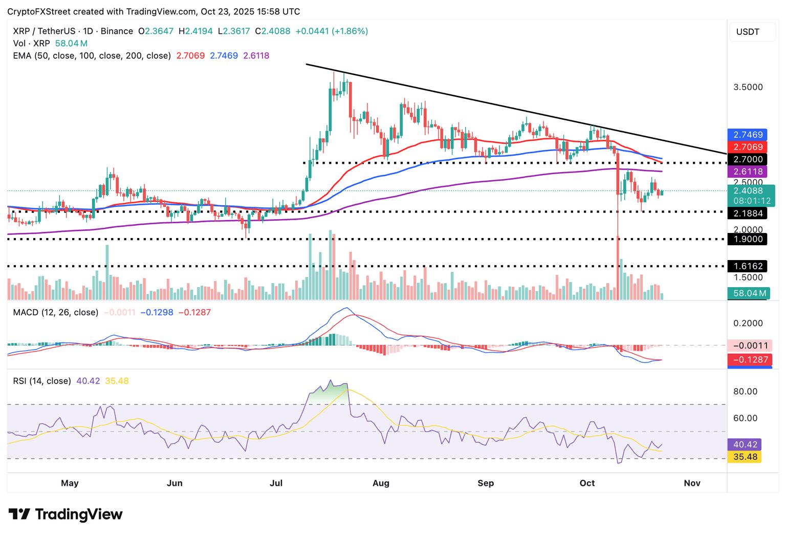 随着更广泛的风险情绪改善,XRP 正在巩固其 2.40 美元的短期支撑位加密货币市场。日线图上,相对强弱指数 (RSI) 处于 40 的上行趋势,表明看涨势头正在增强。交易者应密切关注 RSI,因为 RSI 回升至中线上方则表明势头强劲。