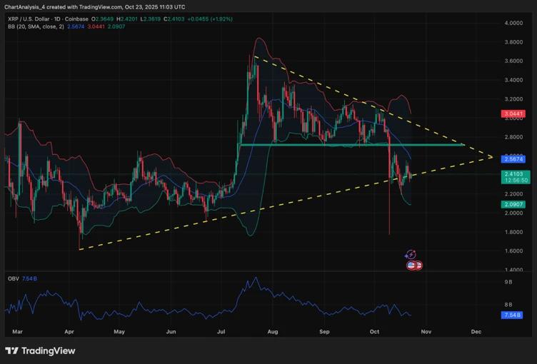 从好的方面来看,2.56 美元是临界阻力位,这一区域曾多次限制XRP的上涨势头。这两个区域之间的价差收窄表明市场压力加大,波动性下降,这一技术形态暗示突破可能即将到来。