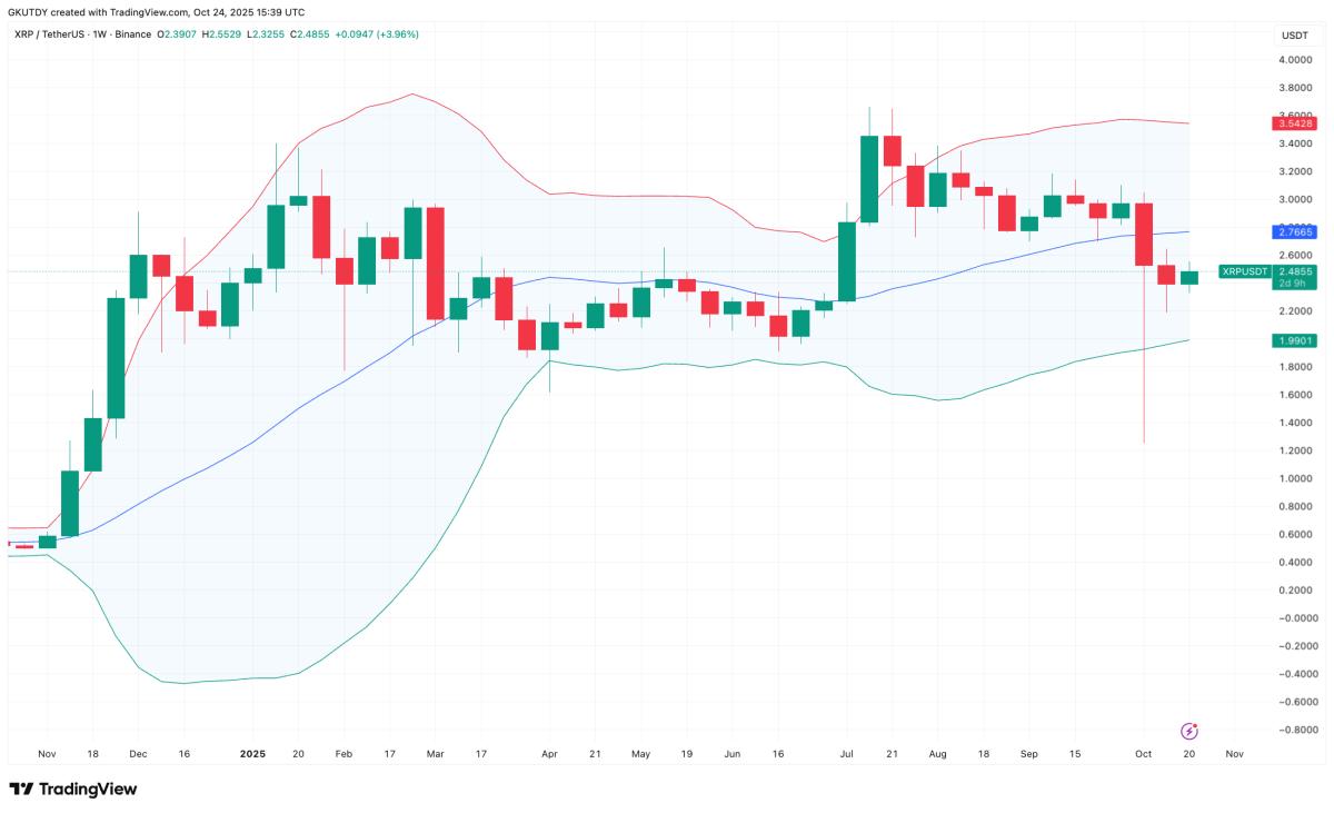 过去几天,XRP 价格一直在布林带区间内震荡,同时仍处于看跌的格局中。从 2.32 美元的低点反弹后,XRP 目前徘徊在 2.49 美元左右,但这一走势发生在布林带下轨的深处。分析师指出,布林带既能反映波动性,又能反映方向性,而在本例中,XRP 的走势在 10 月份迄今为止持续偏向看跌。