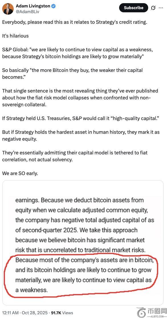他认为,标准普尔的评估“错误地将比特币视为一种负债而非资产”,实际上阻碍了企业采用比特币。