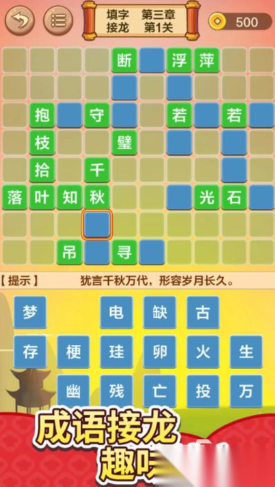 画面设计很简约,玩的时候要一直进行成语接龙,答对各种成语题目就行。既能玩得开心,还能在玩的过程里学成语知识,在这里能体会中国文字的深厚底蕴。关卡难度会慢慢增加,想顺利通关没那么简单,里面有不少烧脑谜题等着挑战,看看大家能答出多少,还能慢慢了解更多成语相关知识。操作方法很简单,点一点屏幕,选对合适的字或词就可以。