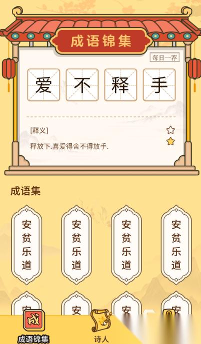 这个游戏界面是卡通风的,看着不复杂,里面设计了不少和成语相关的关卡,需要我们把关卡里的成语补完整才行。补成语的时候能从屏幕下面给的字里挑着填,等一个成语填完,就能接着玩下一关了。玩的过程中既能学到新成语,还能了解每个成语背后的小故事,它的成语题库挺全的,包含的词语数量不少。还能一点点把游戏里的房子升级,不过要留意,每玩一次关卡都会消耗一定的体力。