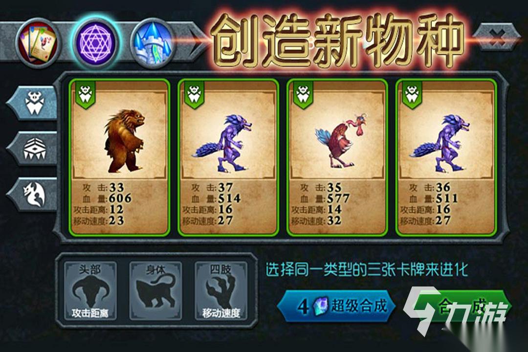《兽王争霸》游戏中以不同的猛兽作为游戏的主角,并且游戏内的猛兽们都有不同的类型,例如,攻击型、治疗型等。而且它们也各自的属性,所以玩家必须按照猛兽们的属性、类型,作出最合理的搭配,发挥它们的最大能力。不同类型的猛兽可以带来不同的羁绊效果,战术的搭配决定着战斗胜负的走向。而且游戏中还允许玩家通过自我融合设计不同的生物参与作战,也能为战场带来更多的可能性。