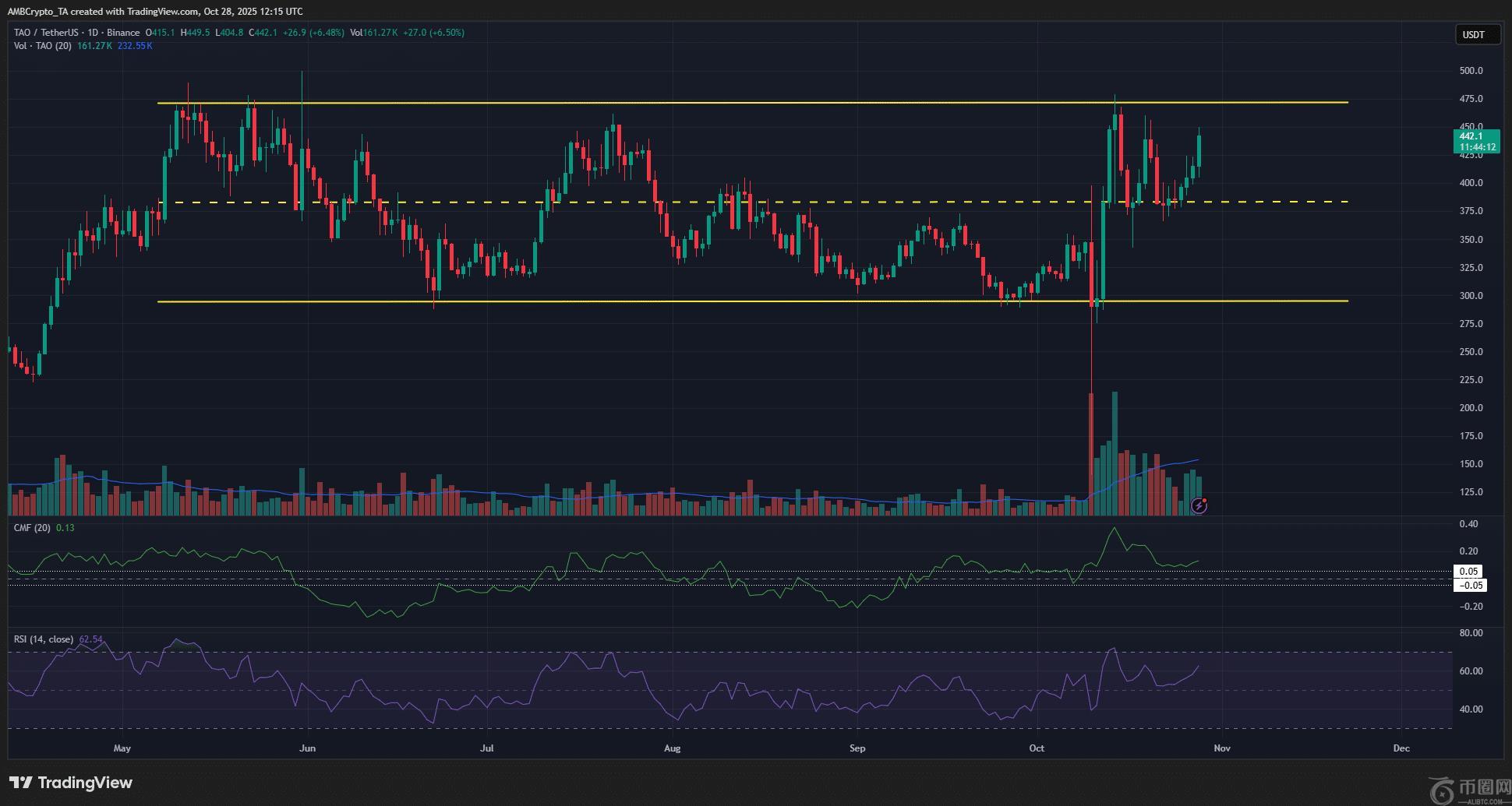 值得注意的是,10 月 10 日的暴跌并未导致 TAO 价格跌至区间低点以下。