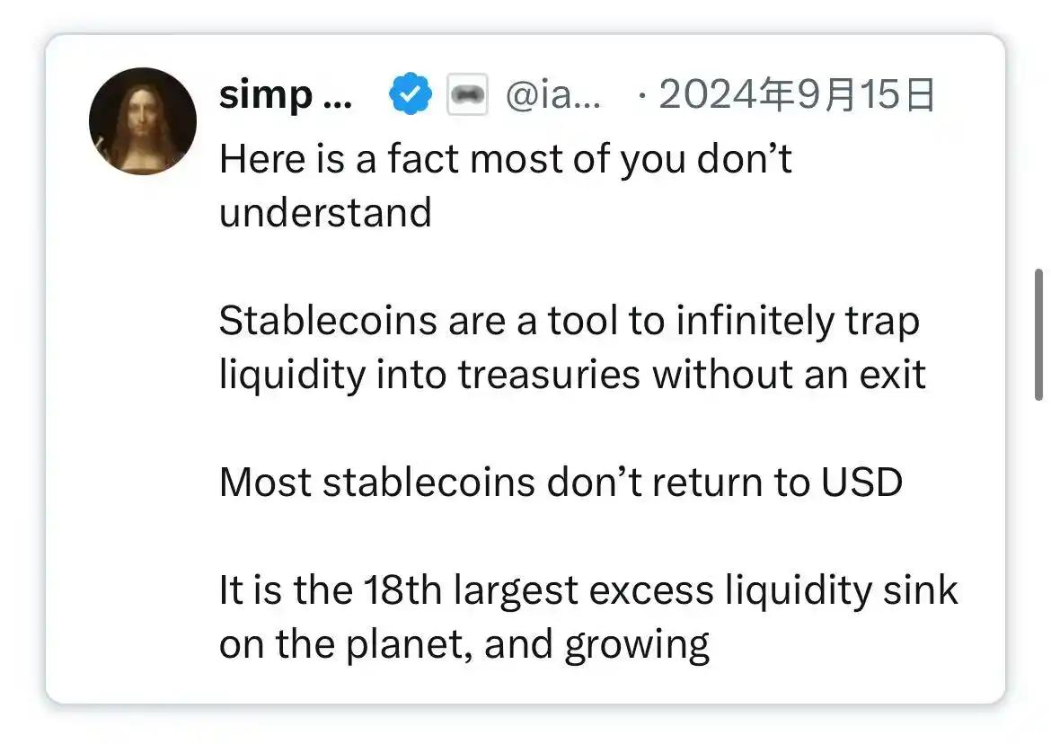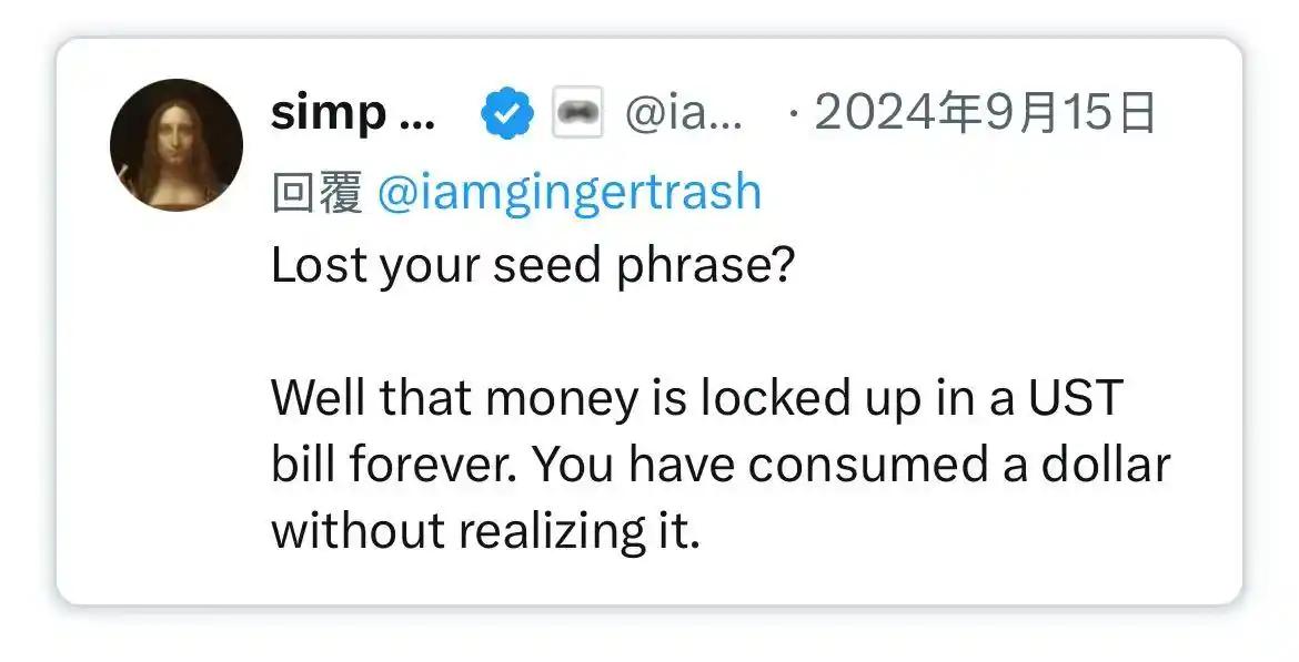 不过,就像比特币一样,也存在一小部分「种子短语丢失」的情况。在稳定币的语境下,这意味着部分资金将永久锁定在美国国债中,无法赎回,实际上成为了一个流动性的黑洞。