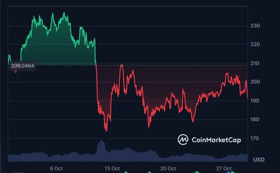 截至10月底,SOL股价在180美元至210美元之间波动,过去30天内下跌了近10%。专家表示,如果Solana股价突破210美元至220美元的阻力位并守住,则有望在2025年晚些时候向260美元的目标价位迈进。