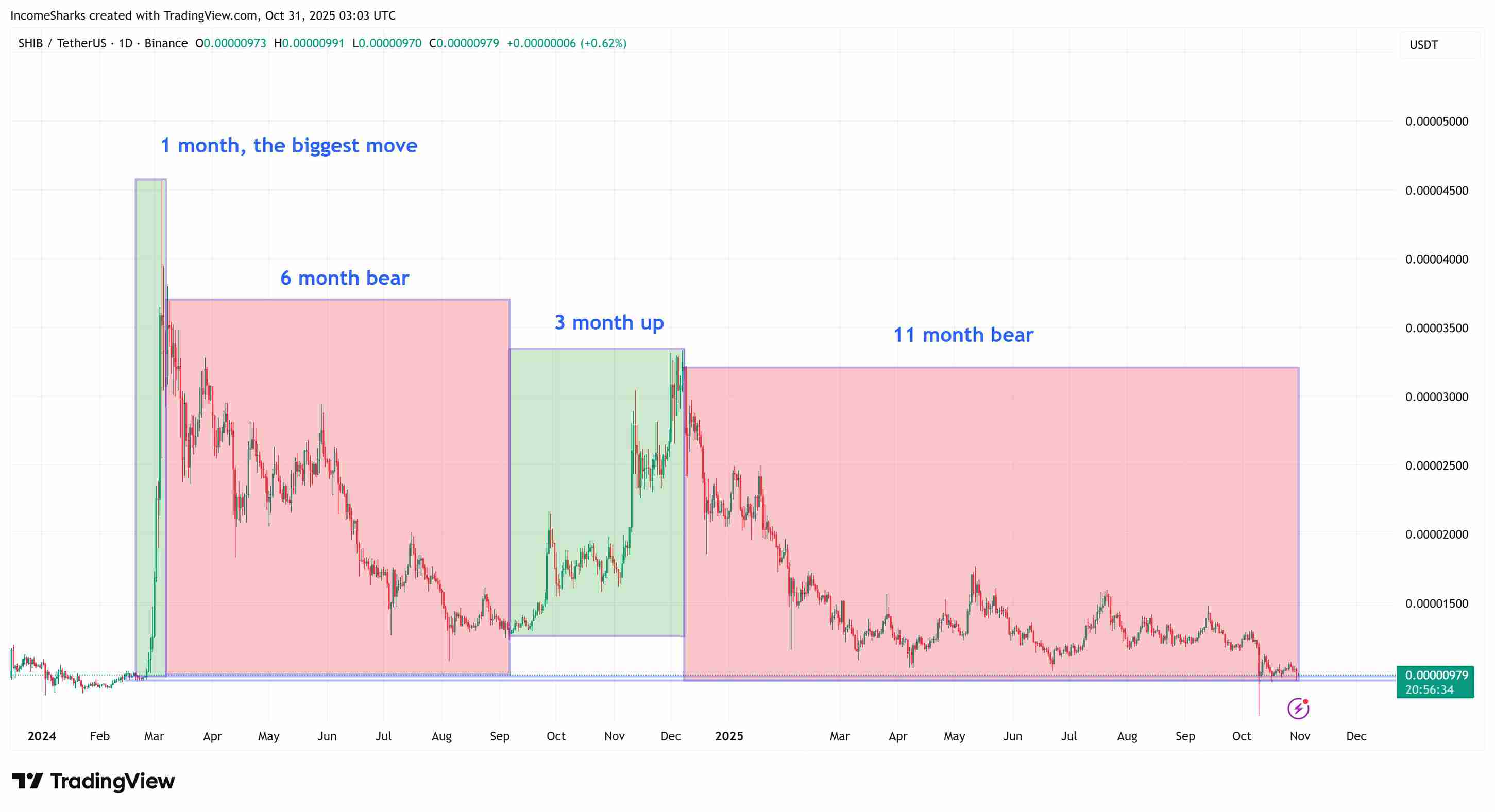 持有者感觉价格回升了,但随后价格盘整至 2024 年 8 月的低点 0.00001078 美元。值得注意的是,这一盘整持续了 6 个月,之后才出现下一轮上涨。