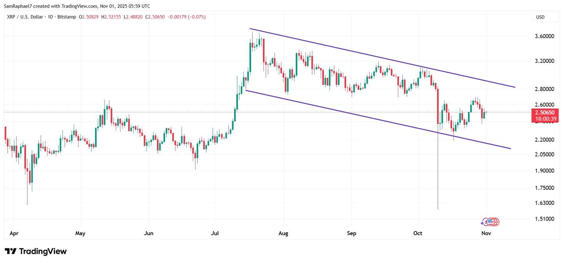 对 XRP 价格的影响显而易见。具体来说,因为7 月份的辐射XRP 已经见证更低的最高点和更低的最低价。这导致日线图上形成了一个下降通道。