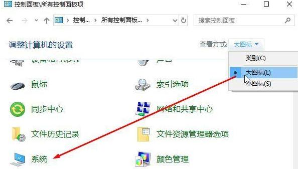 2、在控制面板窗口中,将查看模式更改为【大图标】,在下方找到并点击打开【系统】选项卡,如下图所示。