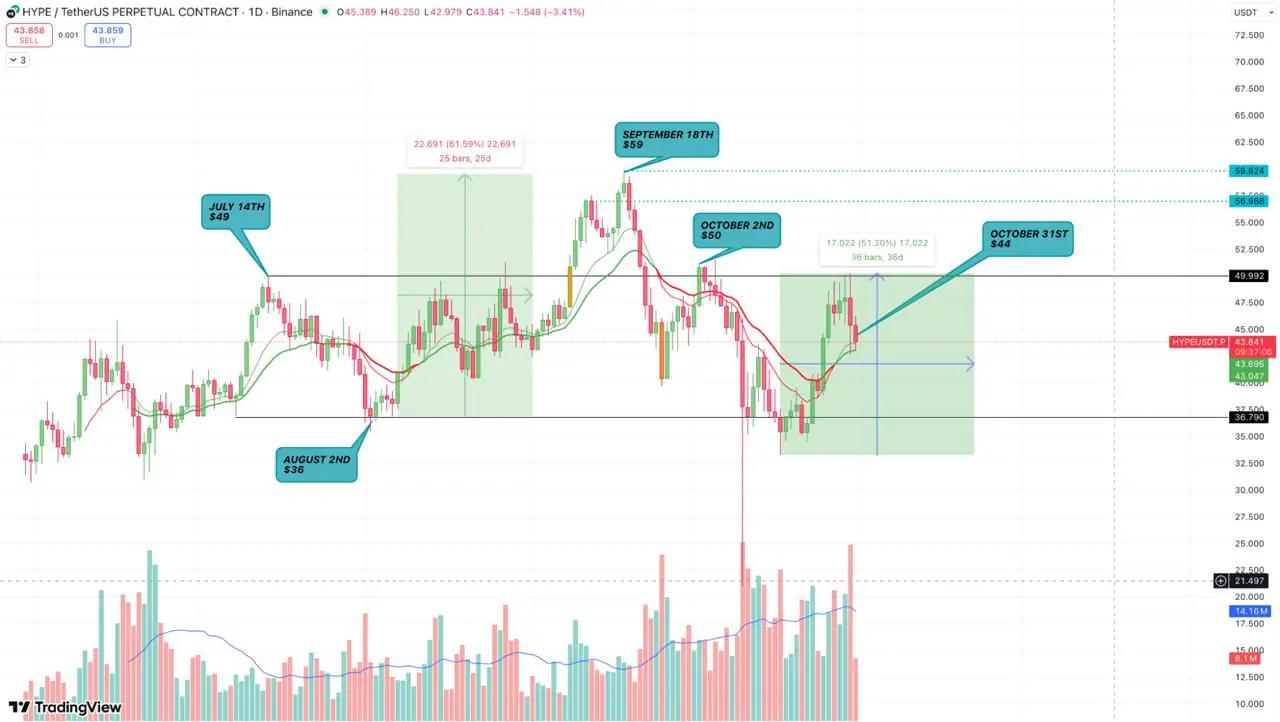 ETF提案(例如 21Shares ETF)这导致交易者/投资者追逐涨势。之后,该代币在10月初跌至32美元,可能是由于早期持有者积极获利了结所致。而现在,HYPE代币已经反弹,从月中38美元稳步上涨至……48美元以上截止日期为10月27日。