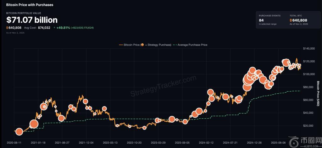 根据市场报道中总结的报告和文件,Strategy目前持有约 640,808 枚比特币,平均每枚比特币的成本约为 74,302 美元。