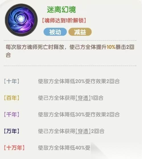 第1个被动效果是在敌方魂师死亡时释放,己方全体提升暴击,持续两回合,还能额外附加降低治疗效果,使己方全体获得穿透。穿透效果是当攻击存在护盾的目标时,可额外造成伤害,并且不会被护盾所抵挡,这样对于限制对方的治疗魂师和前排肉盾都有着很强的针对性。第2个被动是在自身被附加任意减益状态时,可以将效果直接转移回对方,另外在触发后还有几率立即释放一次主动技能并额外附加流血。这样胡列娜就不惧对方的控制效果,这在竞技过程中是非常有优势的。