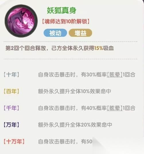 最后一个妖狐真身,第二回合释放,己方全体永久获得吸血加成,在自身攻击暴击时有几率眩晕,还有额外提升全体效果命中属性等。所以作为控制系魂师,胡列娜是非常称职的一个,她不仅可以有效的限制对方,自身在输出方面也非常出色,还可对整个队伍都有伤害方面的加成。阵容搭配推荐大家走反击流路线,选择古榕、尘心、胡列娜、邪月和宁荣荣。古榕是很好的前排肉盾,尘心作为强攻系魂师输出很高,尘心和邪月一起配合起来,在胡列娜的控制和增伤辅助之下输出非常暴力。