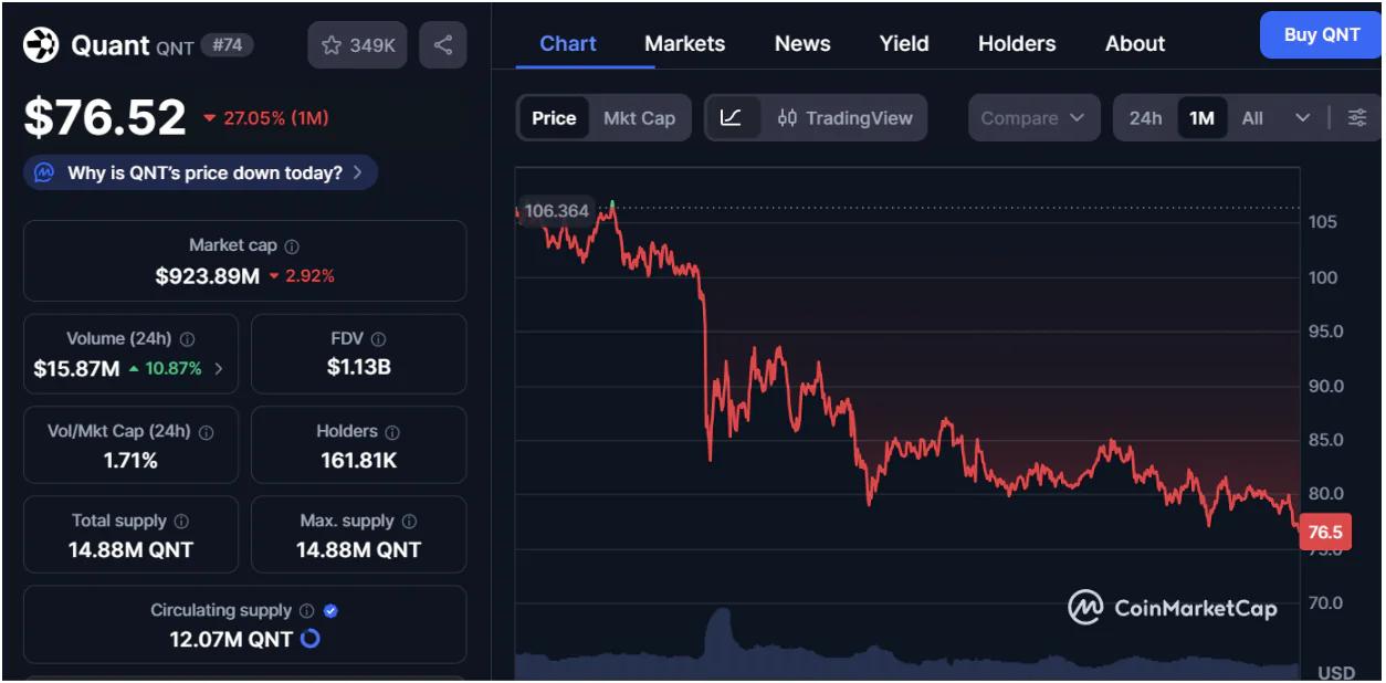 加密货币市场再次降温,很少有代币比以下这些代币更能清晰地反映出这一现实:Quant (QNT)QNT曾被视为最有前途的企业级项目之一,但其价格已从三位数高位回落,目前交易价格约为76.84美元几乎下降过去一个月增长了27%。.