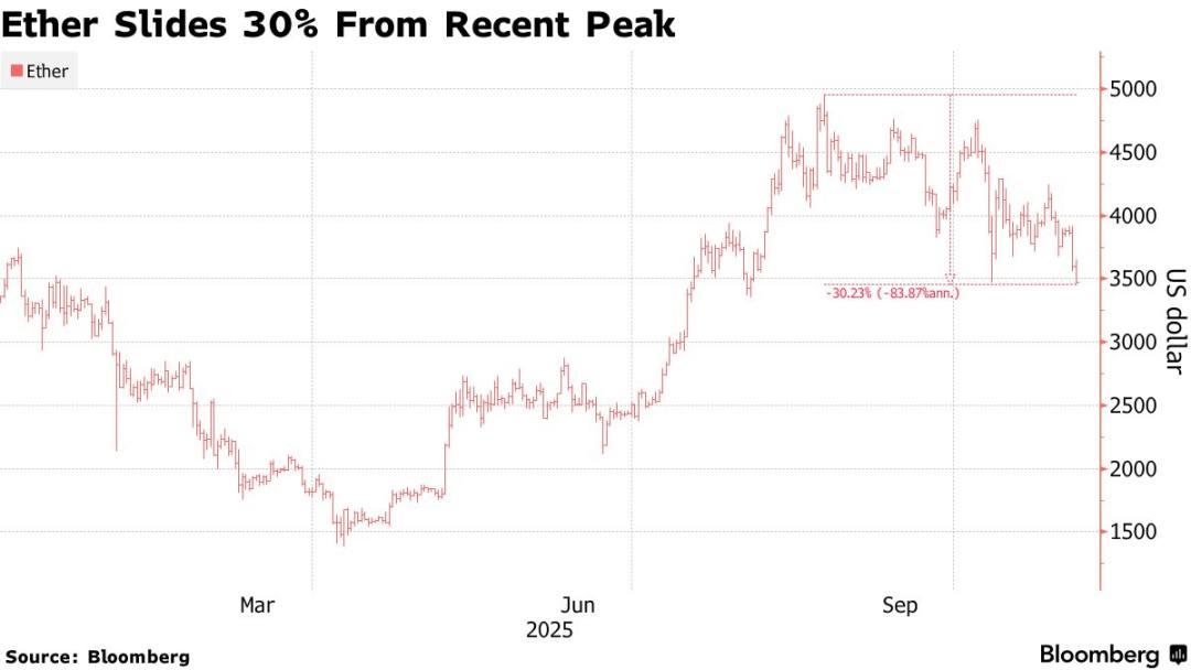 这一全球第二大加密货币周二跌破 3300 美元,与市场风向标比特币及科技股同步下跌。此次下跌使以太坊价格较 8 月峰值回落 30%,跌至企业大规模买入持仓前的水平,进一步巩固了其进入熊市的态势。