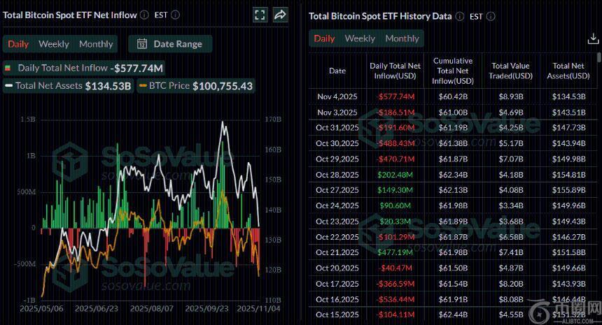 迄今为止,机构对比特币的需求持续减弱。本星期SoSoValue数据显示,现货比特币ETF周二录得5.7774亿美元的资金流出,延续了自10月29日以来的每日资金流出趋势。此次流出是自8月初以来单日最高纪录。如果资金流出持续并加剧,比特币的价格回调可能会延长,表明机构投资者信心下降。