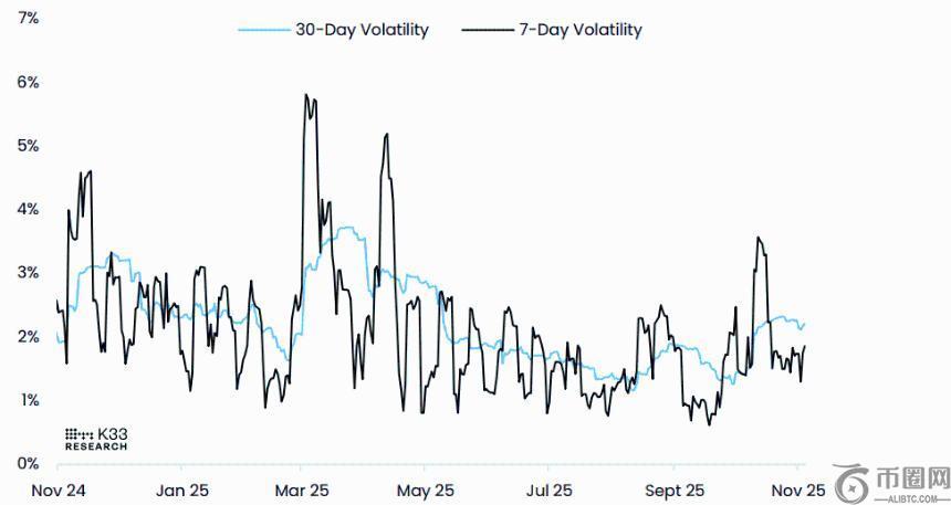 K33 Research 周二发布的一份报告指出,比特币近期的价格调整是以一种稳定有序的方式进行的,短期波动性没有出现大幅飙升。
