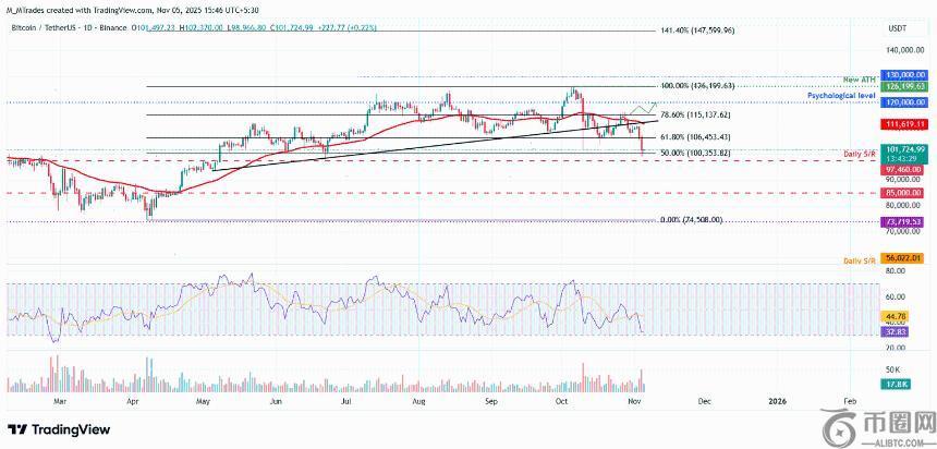 比特币价格周一,比特币价格在此前跌破的趋势线附近遭遇阻力,下跌8.18%,并在第二天回落,重新测试了100,353美元的50%回撤位。截至周三发稿时,比特币在100,353美元附近获得支撑,交易价格略高于101,000美元。