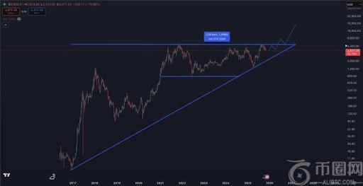 以太坊正在进入一个全新的超级周期时代,当前的价格ETH 的价格并未反映出其基础架构在过去几个月中发生的巨大变化。一位名为 StockTrader_Max 的全职股票投资者和交易员表示:著名的根据以太坊过去八年的历史走势图,目前的状况不会持续太久。该图还显示,过去五年以太坊的上涨趋势一直处于盘整阶段,而这一阶段可能即将结束。