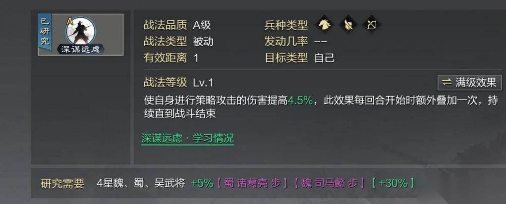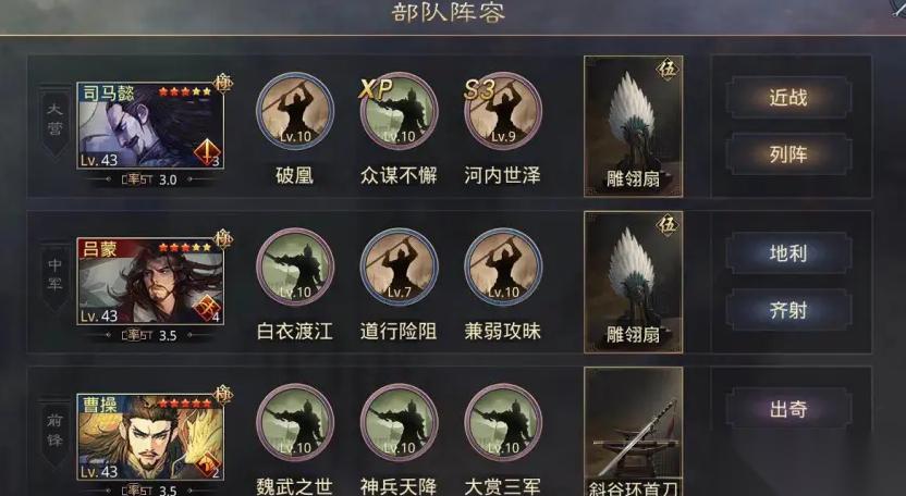在战法搭配层面,破凰需要与特定辅助战法形成体系化配合。深谋远虑能通过每回合叠加的谋略增幅提升破凰的基础伤害,重整旗鼓或三军之众则可弥补司马懿生存能力的不足。若作为副输出位使用,建议搭配始计提升首回合爆发,配合神兵天降等增伤效果可快速建立兵力优势。兵种转换推荐选择禁卫强化防御,属性加点以谋略为主、速度为辅,确保在战斗中能优先出手施加妖术状态。