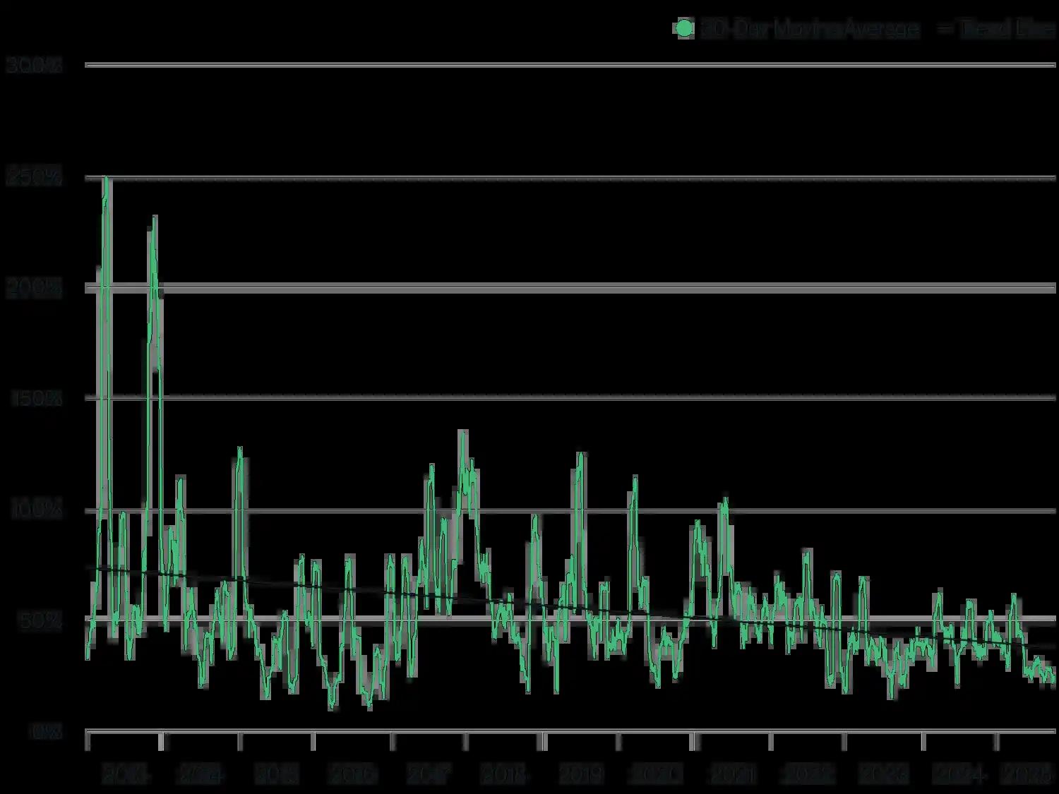 比特币当前的情况亦是如此。随着比特币的持有者从「早期爱好者」转向「机构投资者」,加之其技术不断成熟,如今的比特币已不再面临十年前那种「关乎生存的风险」,它已成为一种成熟的资产类别。这一点从比特币的波动率中可清晰看出——自 2024 年 1 月比特币 ETF 开始交易以来,其波动率已大幅下降。