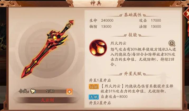 少年三国志2给谁用火云剑?火云剑是一个红色的神兵,在怒气的攻击中可以触发灼烧的效果,后期星级升级后,触发概率会增加到50%,灼烧伤害与武将的攻击力有关。它忽略了防御,会持续两轮,这个神兵的触发效果要看运气,升到七星也不能100%触发,最适合武将的是蜀国的赵云,赵云有一个回火机制,可以频繁释放怒气技能,多次触发火云剑的灼烧。赵云输出稳定,灼烧带来的额外伤害可以让他的战斗力更强,所以他经常打持久战,持续的灼烧伤害可以很好的压制目标。
