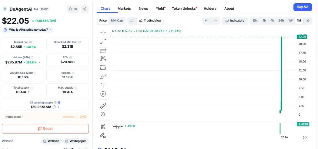 DeAgentAI (AIA)刚刚经历了2025年最强劲的涨势之一。人工智能基础设施代币AIA单日涨幅超过722%,一周内更是惊人地飙升了1004%。AIA股价最高达到22美元,市值突破27亿美元。